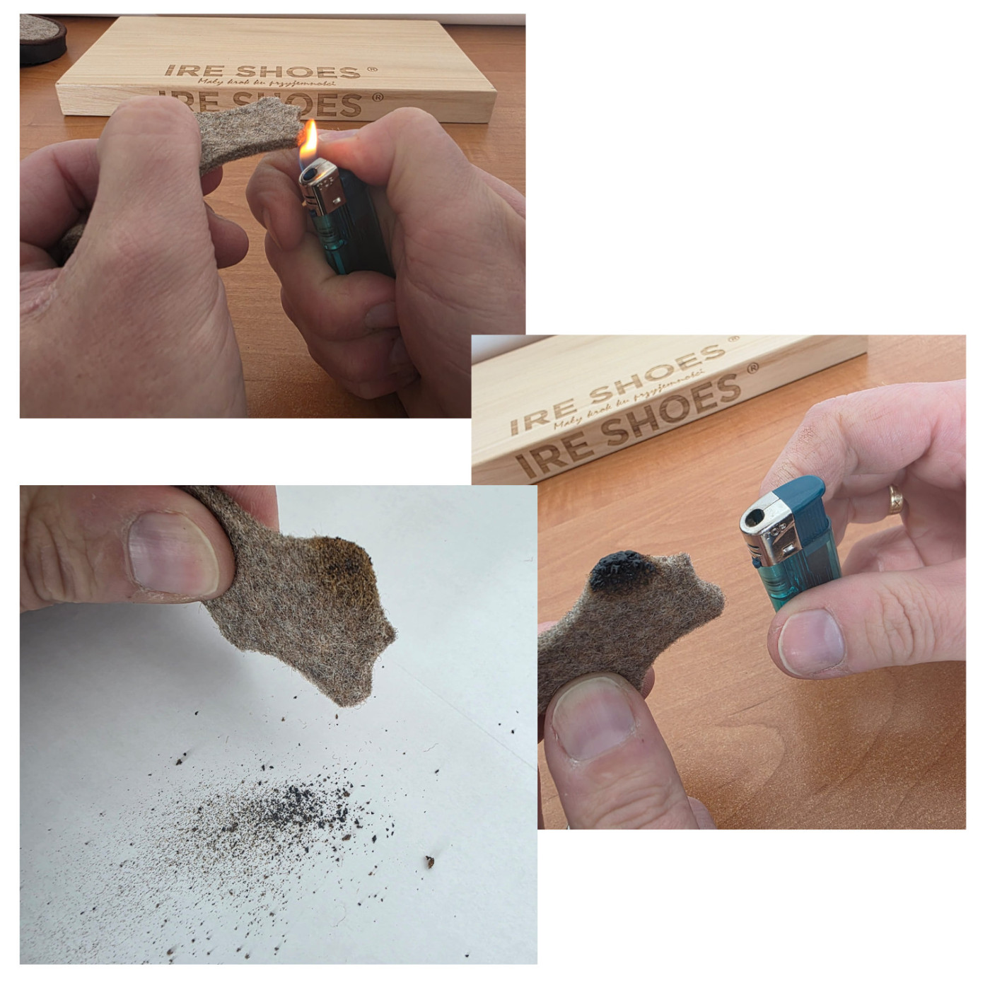 Naturalne materiały się nie palą, podpalona wełna zwęgli się a po wystygnięciu pokruszy się na proch