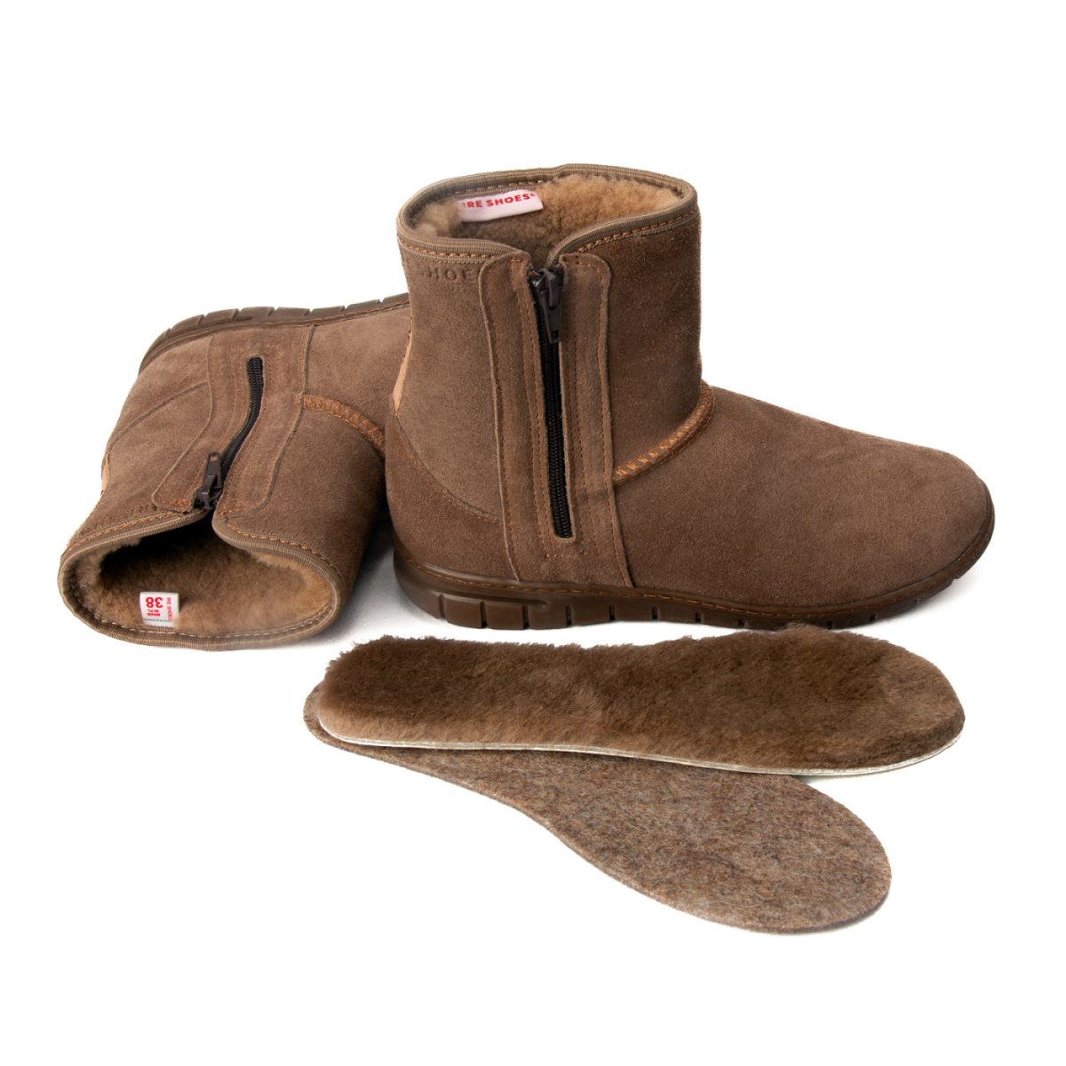 - Wnętrze botków wykonano z miękkiej owczej skóry z wełną, która zapewnia wyjątkowe ciepło i przyjemny mikroklimat dla stóp – nawet bez skarpetek.