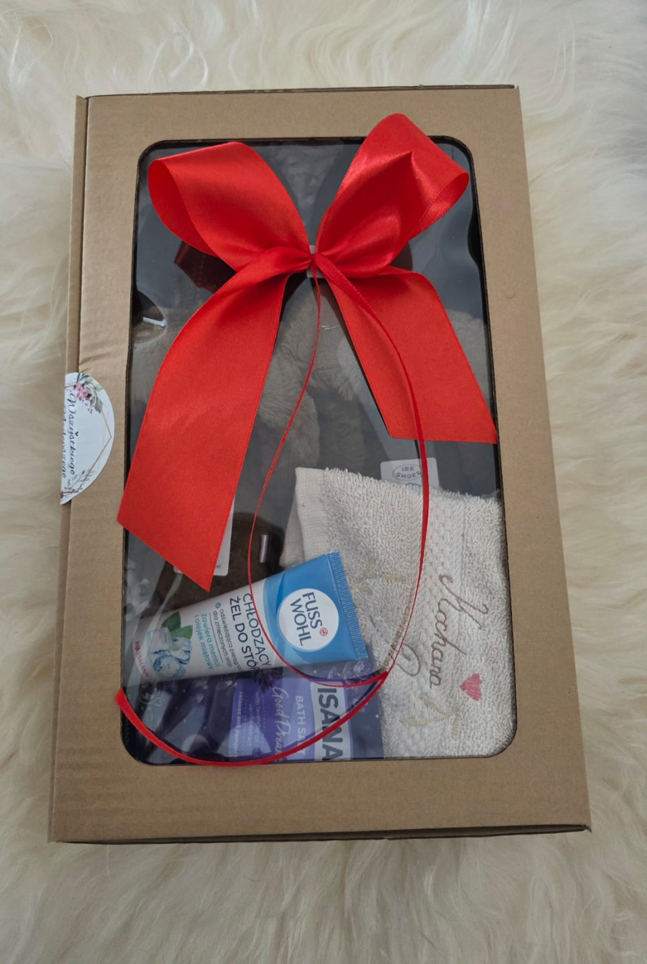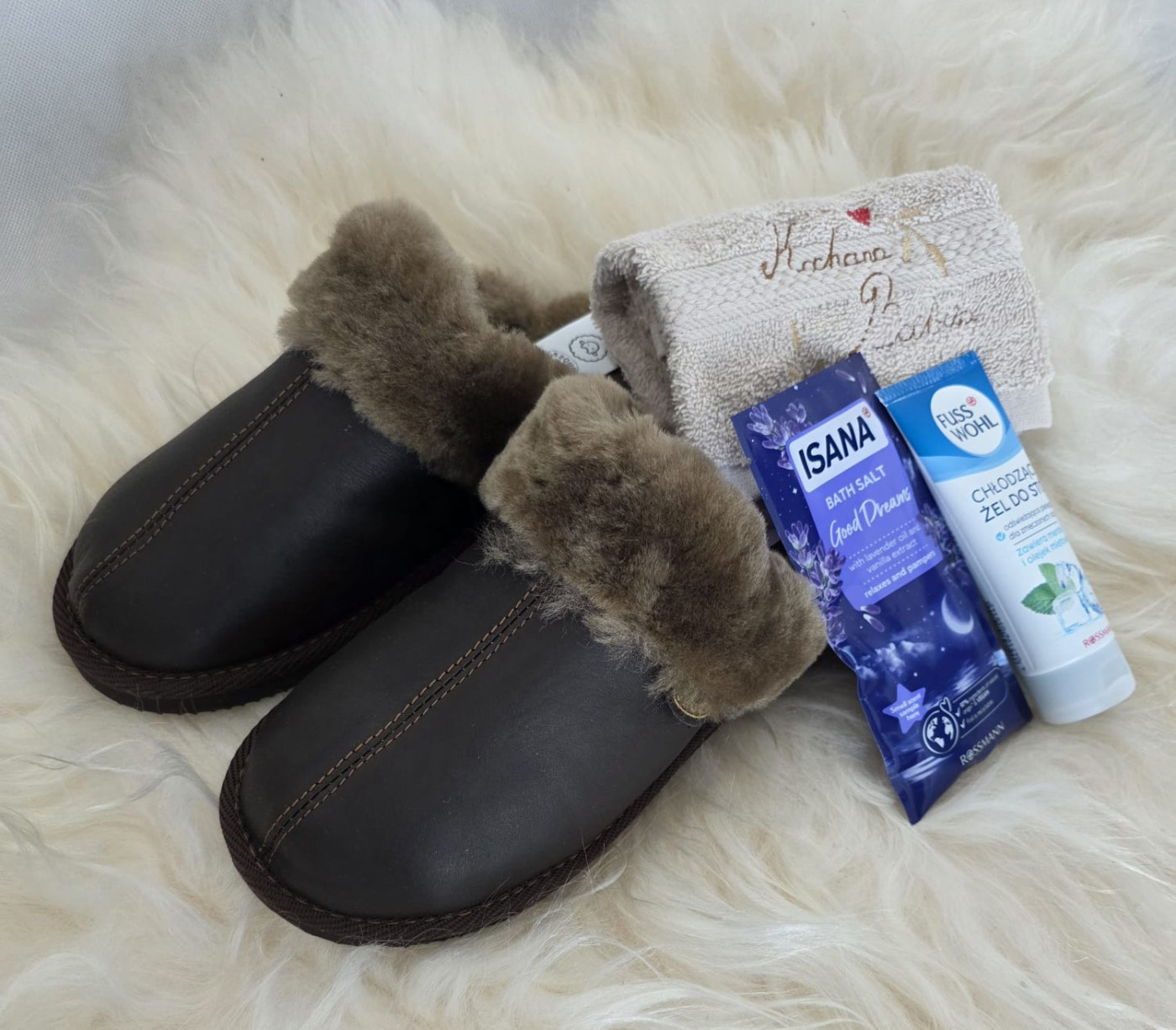 Zestaw prezentowy dla Babci od IRESHOES– ciepłe skórzane kapcie, ręcznik z haftem, sól do kąpieli i krem nawilżający do stóp. Prezent dla Babci